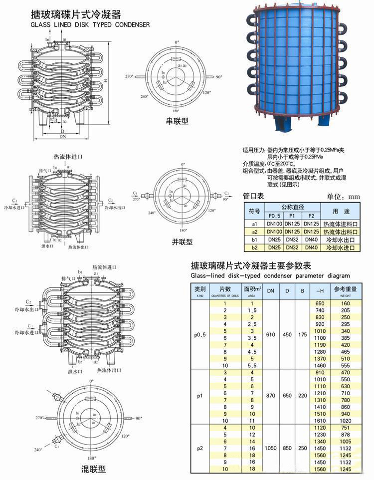 1、搪玻璃碟片式冷凝器分P1型及PO. 5型两种型号。伶凝面积P0.5型,每片为0.5平方米,大香蕉视频网站外径为700mmo P1型,每片冷凝为1平方米,大香蕉视频网站处径为960mm。定型规格为1. 5-15平方米系列,可根据所需冷凝量来选择。